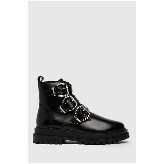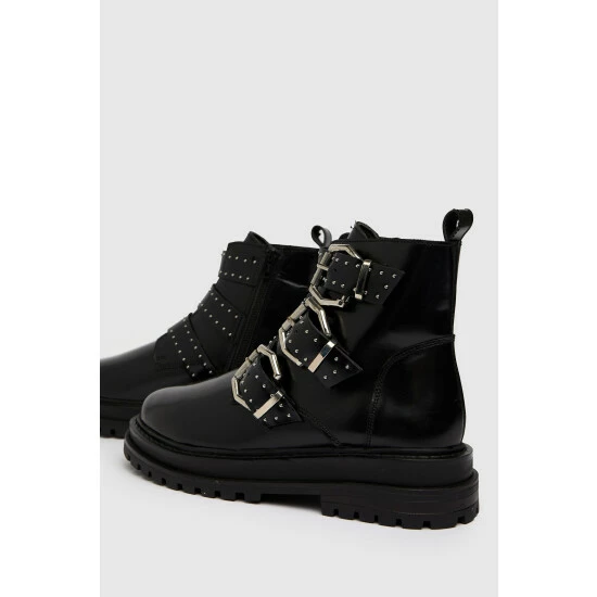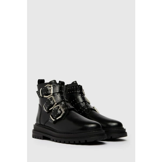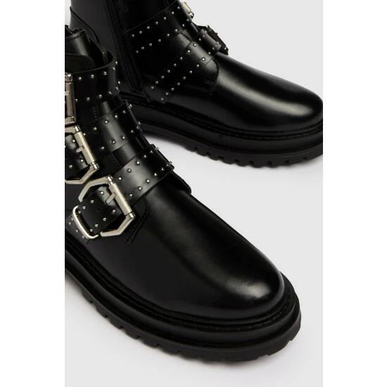 Nail the biker boot trend with the Alyssa Leather Buckle Hardware! This chunky boot boasts a black premium leather upper with added straps, studs and hardcore vibes. Perfect for everyday wear or upgrading your winter wardrobe.