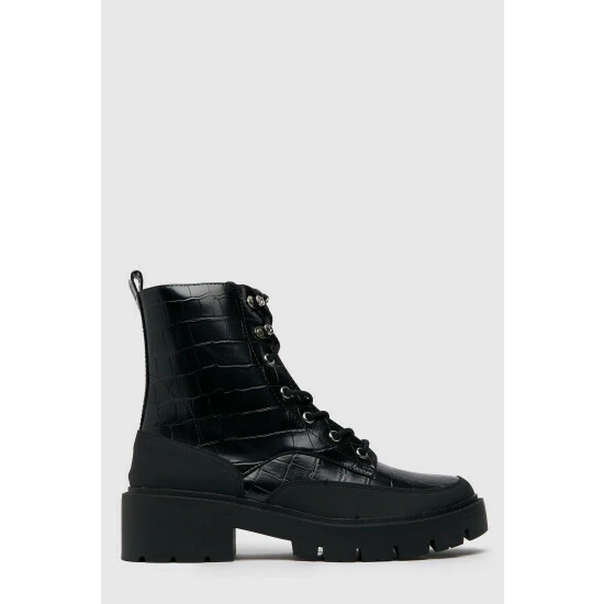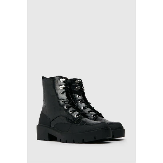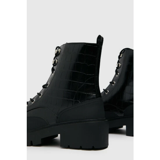 The Autumn Rubber Detail Croc Boot takes the winter trends in a black colourway, man-made upper and real thick sole unit for all the edge. Lace-up closure completes this look.