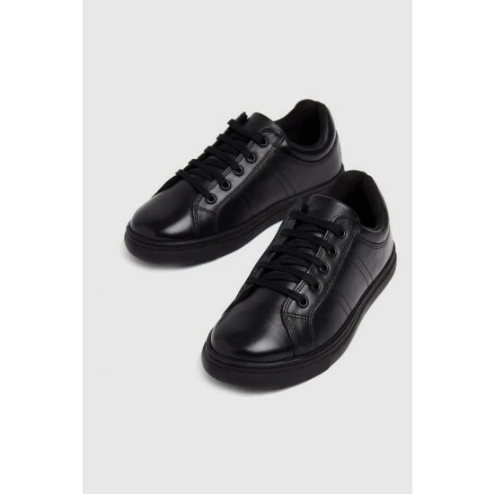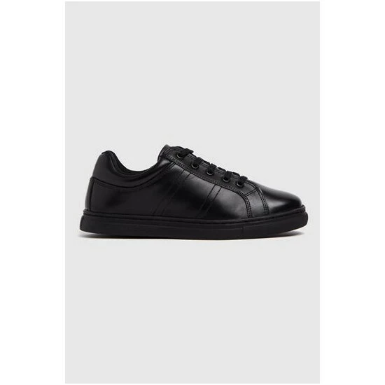 Learn in style with the Schuh Kids Mutual Lace Up trainer! This fit lands in a premium black leather upper with a cushioned collar, perforations and a durable rubber outsole to get them through.