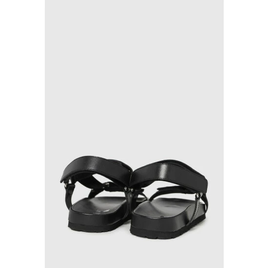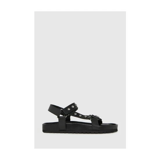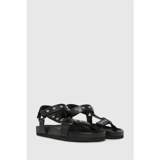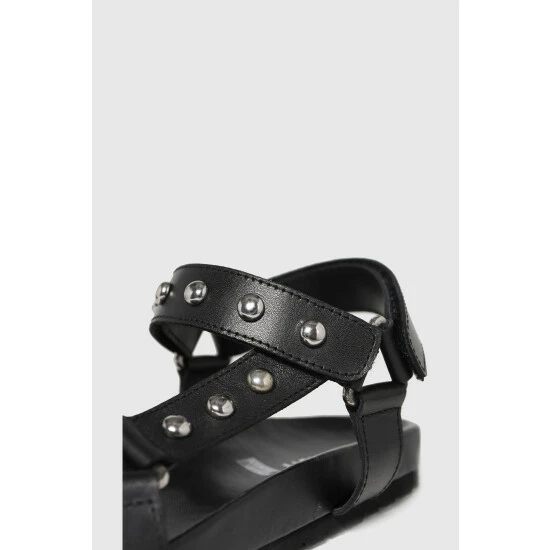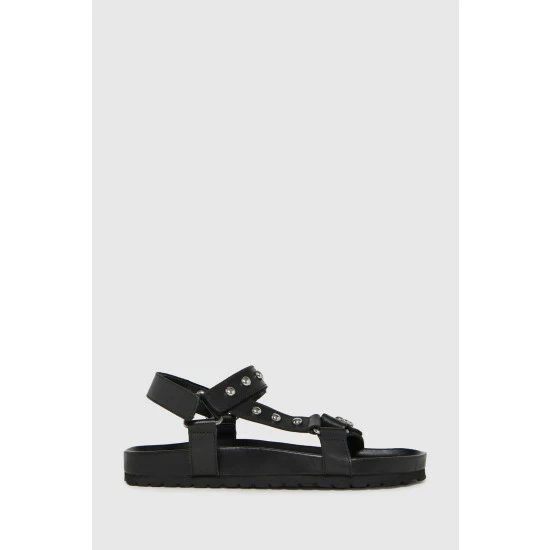Get ready for summer with the Primrose Leather Studded sandal! This fit lands in a black leather upper paired with thick straps with metallic accents and plenty of style.