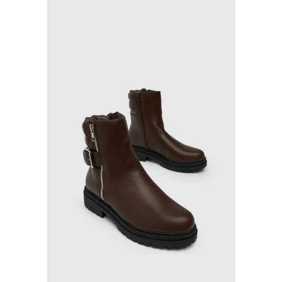Nail the trends this winter with the Arya Buckle Biker Boot! This brown profile arrives with zip detailing, an adjustable buckle and a slight heel for added height on any look.