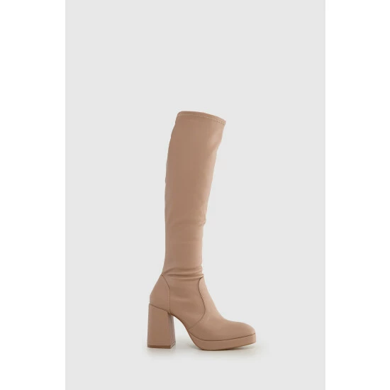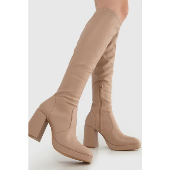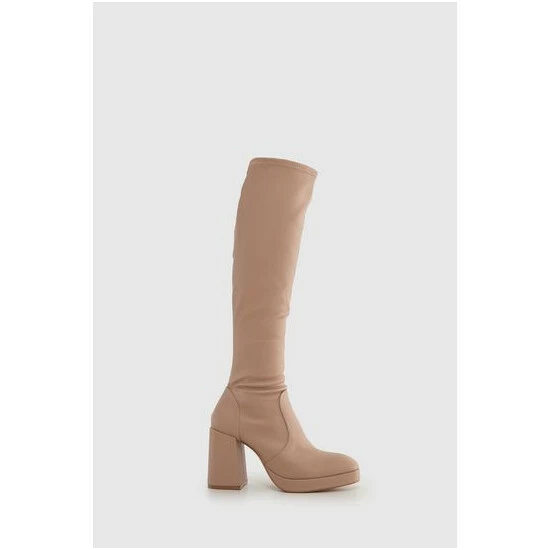 High fashion, chic and definitely on their radar! The Della Stretch Platform Knee Boot provides the sass in a stone man-made upper sat on a block heel for catwalk style. Obsessed yet?
