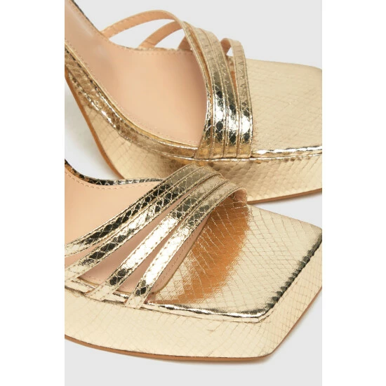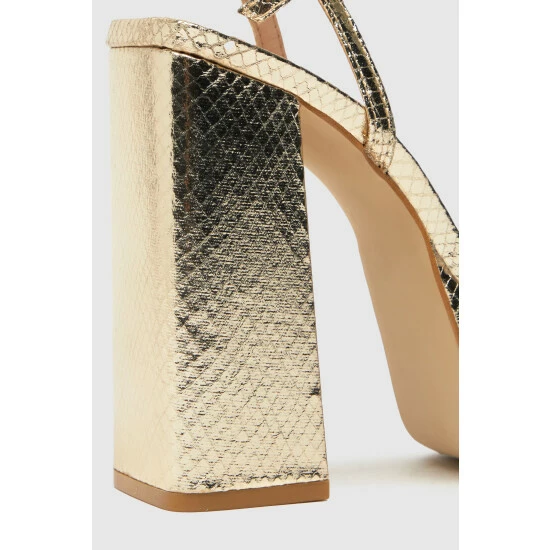 The gold Sklyar square-toe heel from Schuh lands to nail the latest party trends. This chunky platform heel features an all-over snake print with strappy detailing for extra support. A block heel keeps things comfy all-night long.