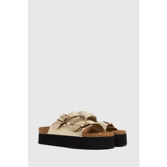 A chunky take on summer style, meet the Tillie Double Height Footbed! This sandal boasts a gold man-made upper with two adjustable straps and real thick rubber midsole. Thank us later.