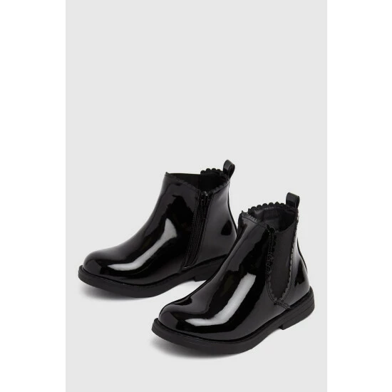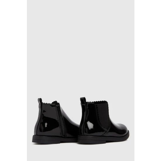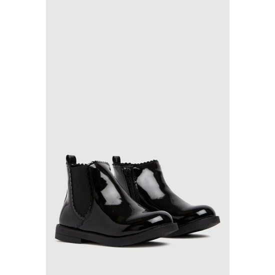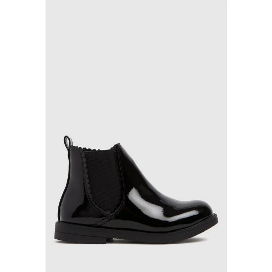 Boot season? they’ve got you covered! The Schuh Kids Chic Chelsea Boot arrives in a black patent upper paired with elasticated ankle inserts and grippy rubber tread – ready for fun.