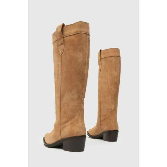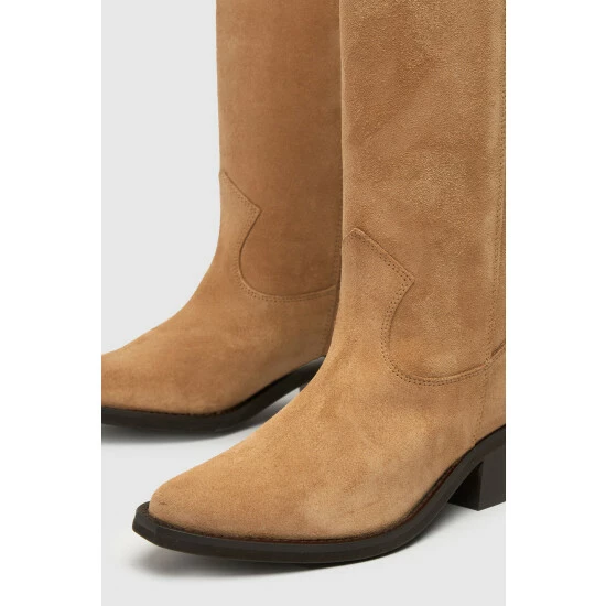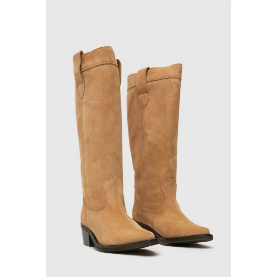 Long cowboy boots? Oh, it’s a yes from us! The dawn western knee boot lands in a tan suede upper in a well-crafted silhouette with a block heel to finish. Staple style your collection craves!