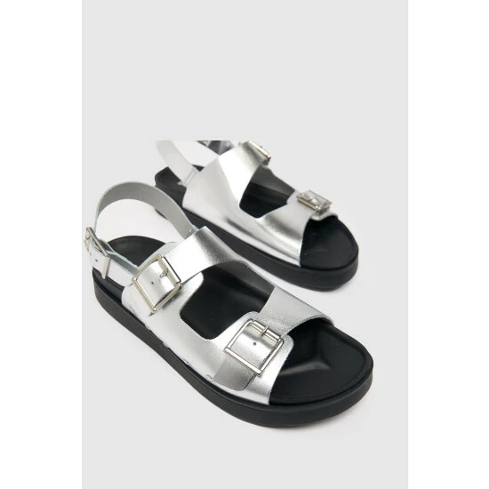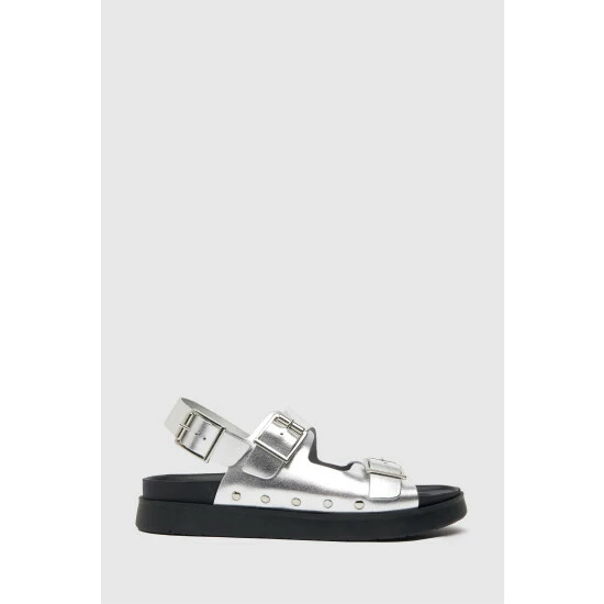 Think summer, think Schuh. The Talis Leather Footbed Sandal is crafted from a premium leather upper in silver and metallic buckle detailing. This comfortable fit is not only on-trend, but durable and ready for fun.