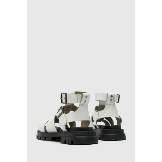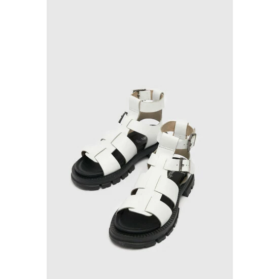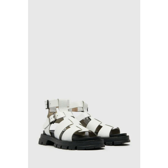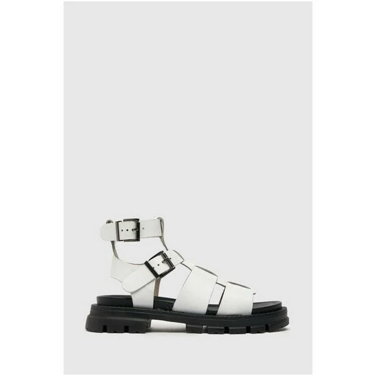 Make it chunky this season with the schuh Trace Leather Buckle Chunky Sandal! This fit boasts a white leather upper with gladiator vibes. Treaded platform sole and thick supportive straps complete. A must-have!!